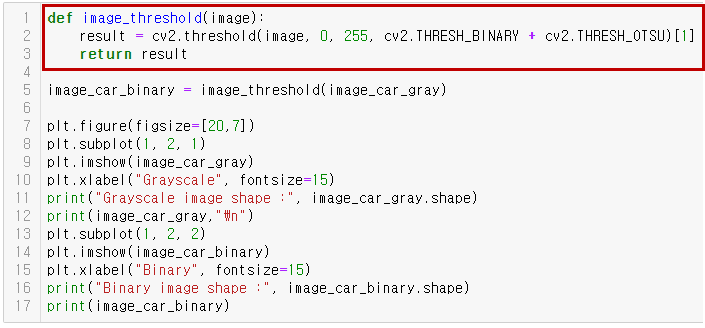 다음으로는 grayscale로 변환한 이미지를 흑과백, 이진화(binary) 이미지로 변환해보겠습니다. Grayscale 이미지를 이진화하기 위해서는 cv2.threshold() 함수를 사용하면 됩니다. 이때 입력하는 파라미터로는 cv2.THRESH_BINARY와 cv2.THRESH_OTSU의 이진화 옵션을 사용하였습니다. 각 파라미터에 대한 자세한 설명은 링크를 참고하시면 좋을 것 같습니다.