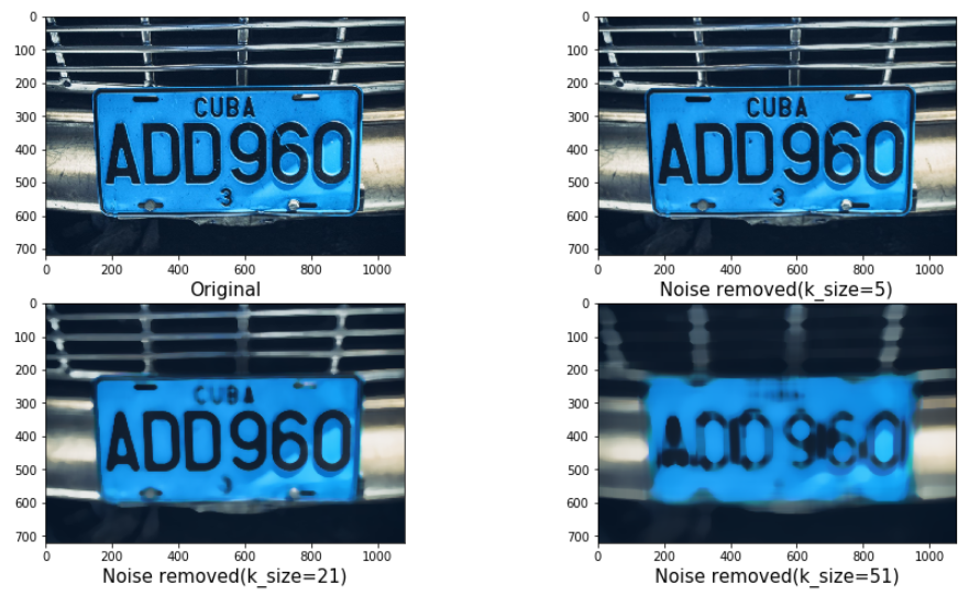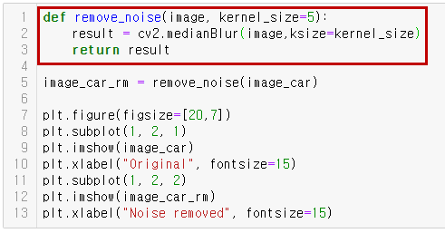 이미지에서 노이즈를 제거하기 위해서는 cv2.medianBlur() 함수를 사용하면 됩니다. Blur의 사전적 뜻은 '흐리게 하다'라는 뜻인데요, 커널이라는 일종의 창함수를 이용하여 커널을 커널내의 중앙값으로 채우는 방식입니다. 커널은 전체 이미지를 훑으면서 이 작업을 반복수행하게 되는데요, 이때 커널 사이즈는 홀수로 입력하여야 합니다. 자세한 사항은 링크를 참조해주세요.