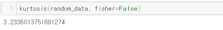 4-1) SciPy의 kurtosis 함수에서 'fisher' 파라미터를 'False'로 설정하면 Pearson's 정의에 의한 kurtosis 값을 구할 수 있습니다.