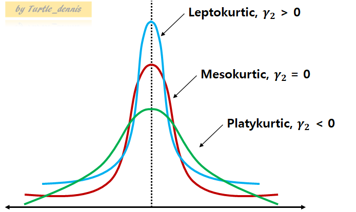 kurtosis에서 3을 뺀 값으로, 값이 0일 때 경우 정규분포를 가지도록 하기 위해 고안됨. 본문에서는 γ2(gamma)로 표현하겠습니다.