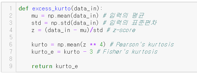 파이썬 패키지인 SciPy의 stats모듈의 kurtosis 함수를 이용하여 구하거나, 직접 함수를 만들어 구할 수 있습니다.